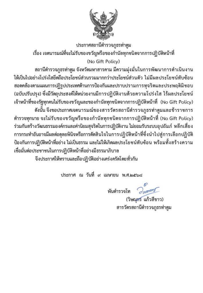 เมื่อวันที่14 ธันวาคม พ.ศ.2567 พ.ต.ท.วิษณุกร แก้วสีขาว สารวัตรสถานีตำรวจภูธรท่าตูม ได้ประกาศนโยบายและมาตรการในการต่อต้านการทุจริต/การรับสินบนในงานที่เกี่ยวข้องกับด้านการสืบสวนและการสอบสวนโดยกำชับเน้นย้ำ ให้ข้าราชการตำรวจสถานีตำรวจภูธรท่าตูม