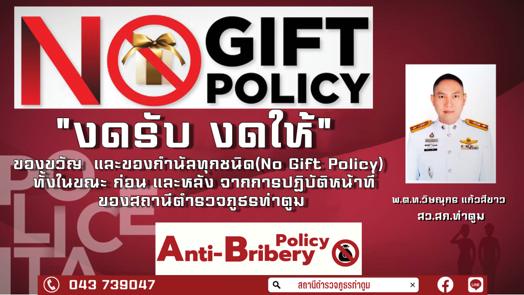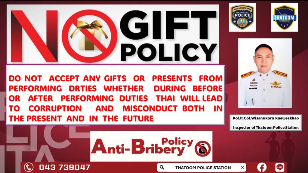 O18 ประกาศนโยบายต่อต้านการรับสินบน(Anti-Bribery Policy)และนโยบายไม่รับของขวัญแลของกำนันทุกชนิด(No Gift Policy)จากการปฏิบัติหน้าที่